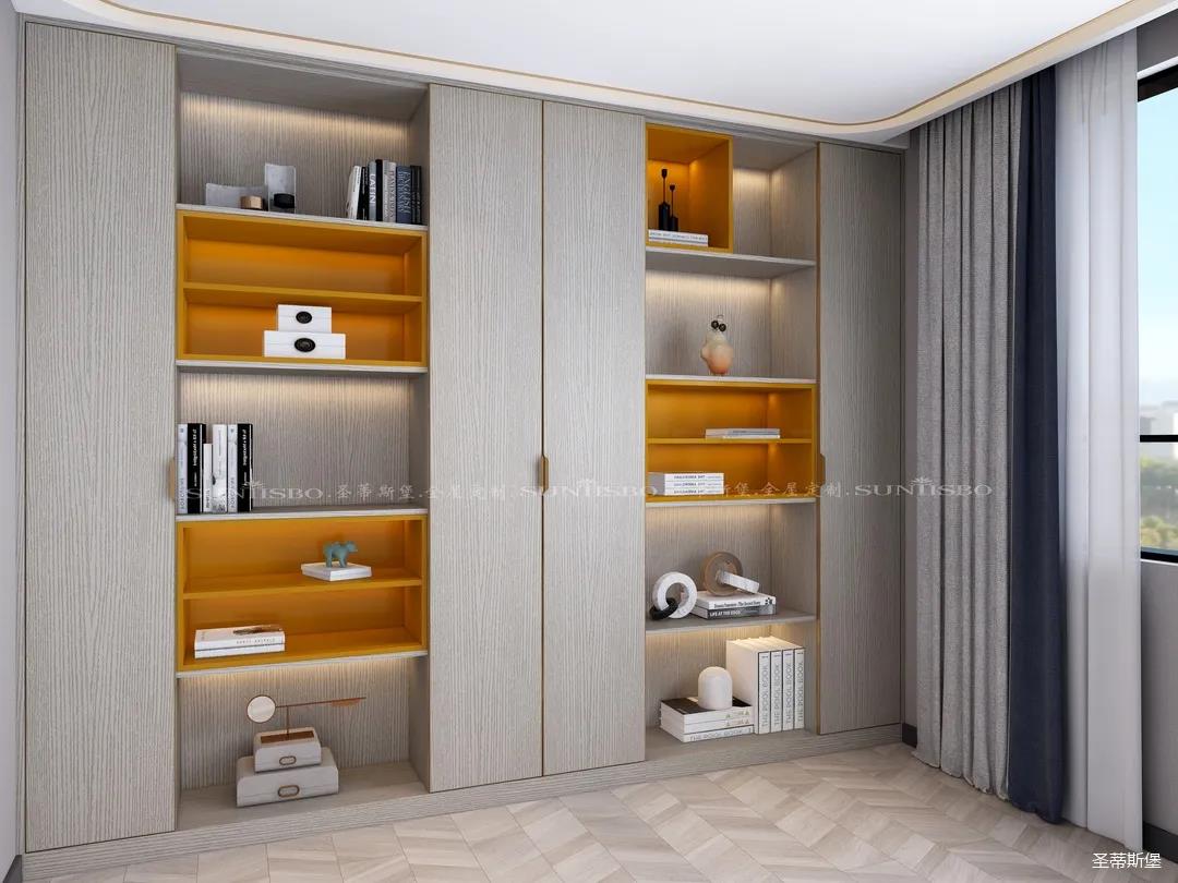 书柜点缀着适当的爱马仕橙,除了自身携带的高贵气质,在聚焦视线的同时,还明确了收纳分区。