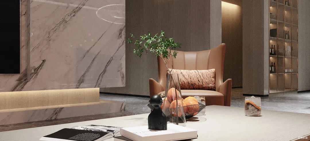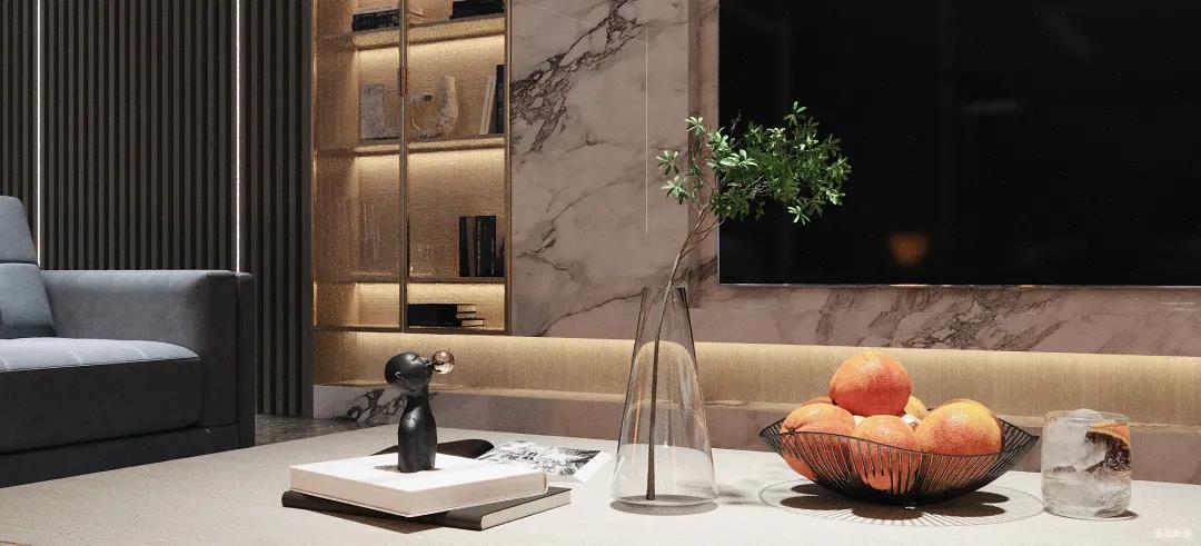 为了减轻现代都市工作的忙碌,客厅设计更偏向于对生活“解压”的极简,精选自然纹理的大理石与实木定制柜做一体化设计,并在电视背景墙下半部分做挑空设计,安装个性十足的线性灯带,延伸客厅视觉深度。