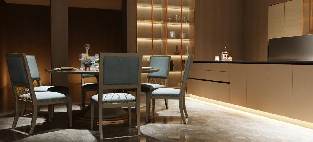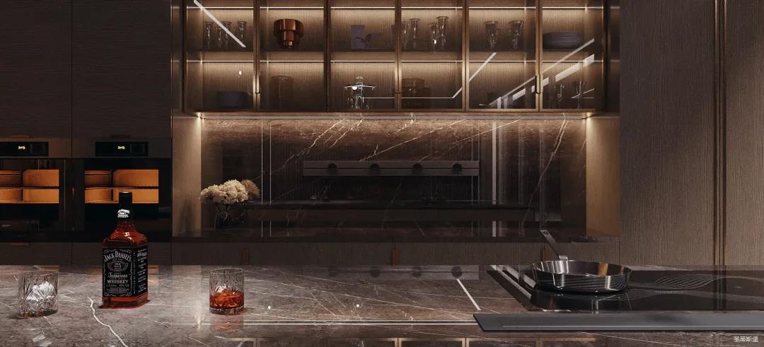 餐厨的极简也可兼具多元,以一字内嵌式展开的厨区收纳柜,兼顾了从杯具、调料等厨用材料收纳到厨电归置动线功能处理。在展示区域,玻璃隔板组合实木定制柜的表现形式,更是提升了空间的明亮度与宽阔感。