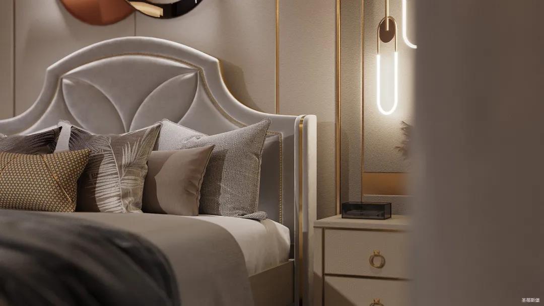 卧室空间整体以护墙板定制为主,整体设计注重空间简约、自然,没有繁杂的装饰。结合业主对理想家的想象,采用暖色调来衬托温馨实感,延伸业主对家的定义,用最质朴的木纹融合极简线条平铺的形式,体悟自然的温度,为都市生活带去不一样的体验感。