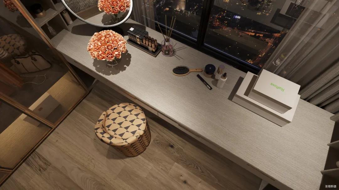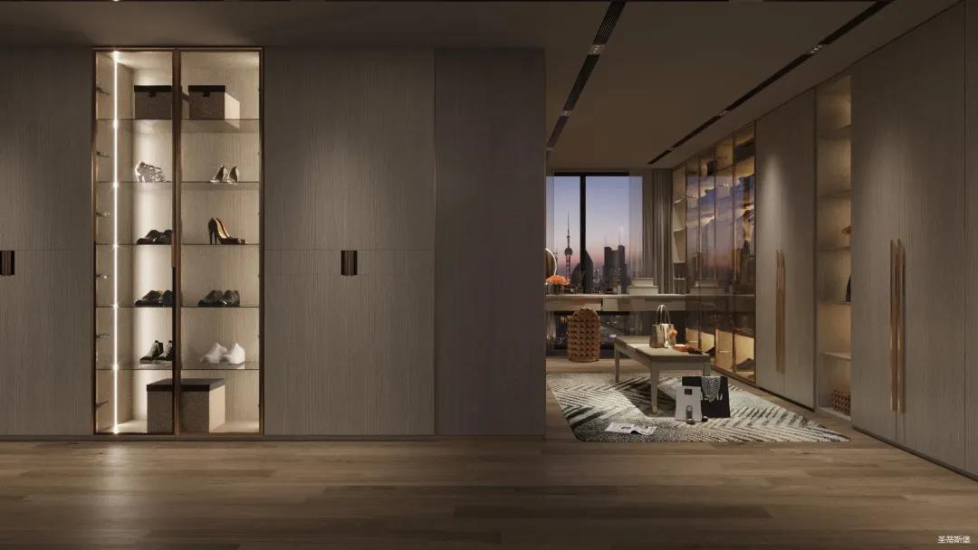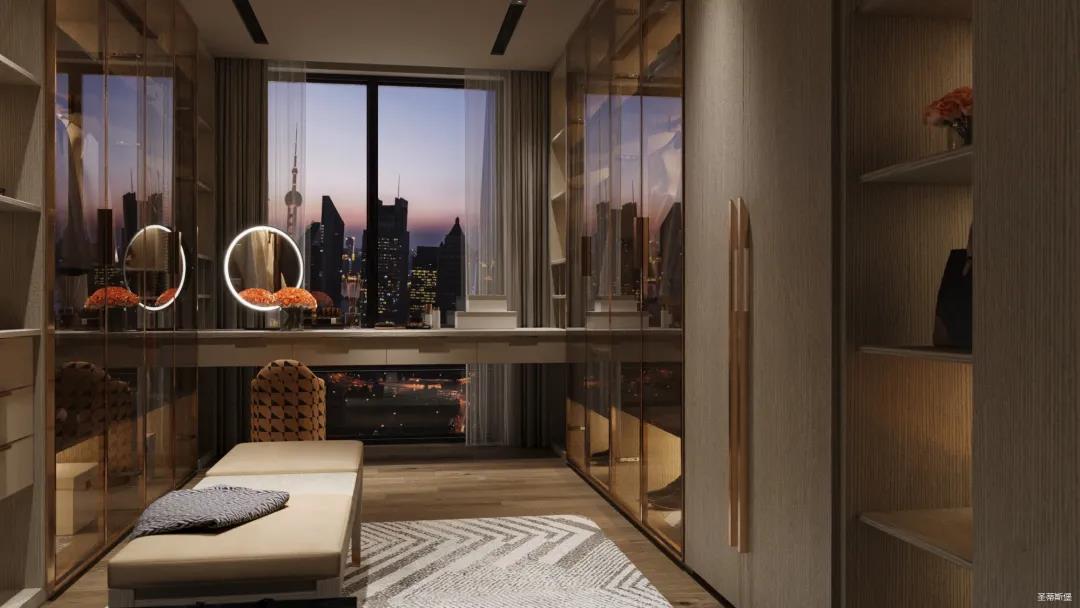 移步衣帽间,精简华丽几乎贯穿了整个空间,质感高级的实木定制柜框架、通透明亮的玻璃展示区、色调醇厚的金属镶边,每一项细节搭配都在强调着业主的高端品位。妆台前的落地窗让我们在观赏都市繁华的同时也屏蔽了都市喧嚣,让我们置身于繁华都市中有一处宁静休憩地。