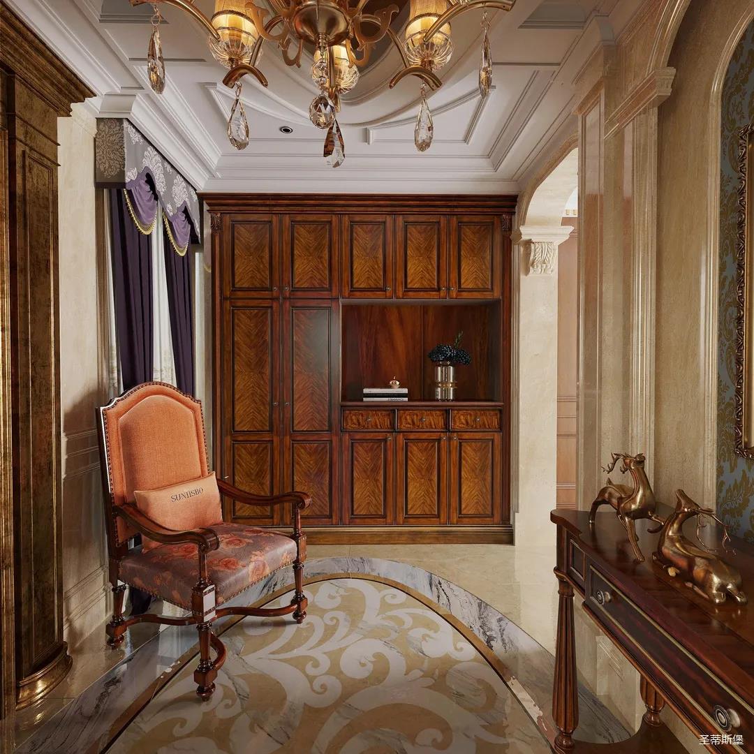 迈进书房,仿佛就来到另一个清丽的世界,抛开身后的尘嚣,恍如隔世般抚慰着辛劳一天的身心。每一物件都经过设计师的精雕细琢,不管是布艺的纹理,木质的雕饰,亦或是真皮的质感,都让大美的豪华一目了然。粗狂中透着柔美的线条,浑厚复古的色调,让空间显得深沉而含蓄,置身其中即可感受到传统的历史痕迹与浑厚的文化底蕴。