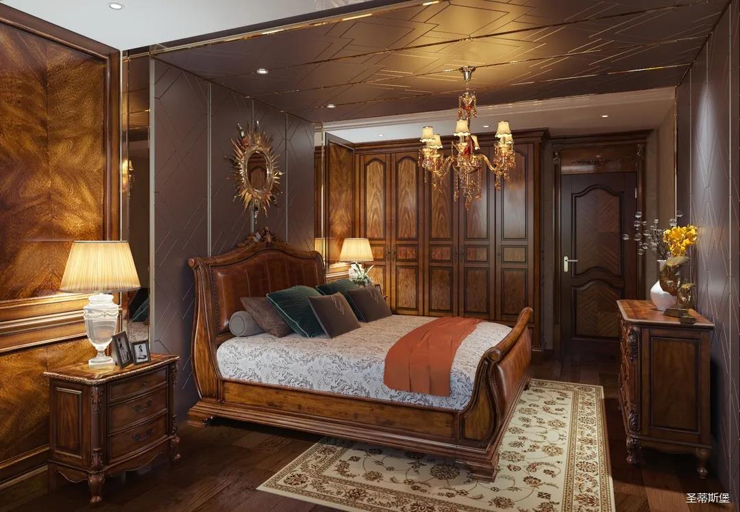 主卧整体设计是美式与现代的完美整合,既保留了纯正美式的形和实木雕刻艺术,又具有浓重的美式配色,浓浓的艺术气息不自觉在浪漫的美式空间流淌。流畅的弧线花饰以及丰富的木作线条别具匠心。大气稳重与舒适雅致并重,并借由开放的布局、灵活的动线,共同促成了整个空间极具复古浪漫的情调。