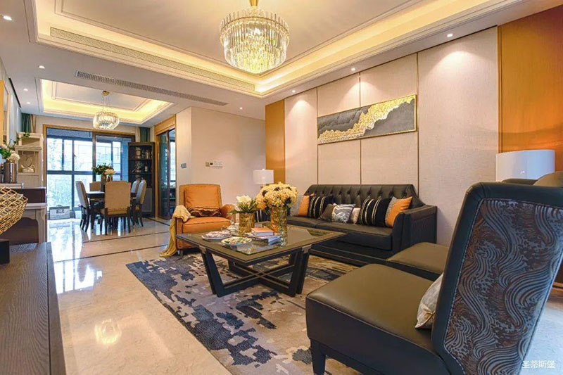 极具时尚设计格调的透明茶几,不仅中和了沙发的厚重感,还令空间更为清透明亮!