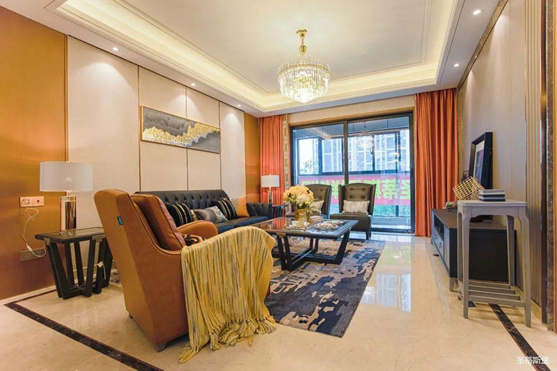 爱马仕橙的休闲椅是空间的点睛之笔,相对于霸气沉稳的墨绿双人沙发,它更为时尚摩登,两者合理搭配,赋予了空间阳刚与柔情并存的意境。