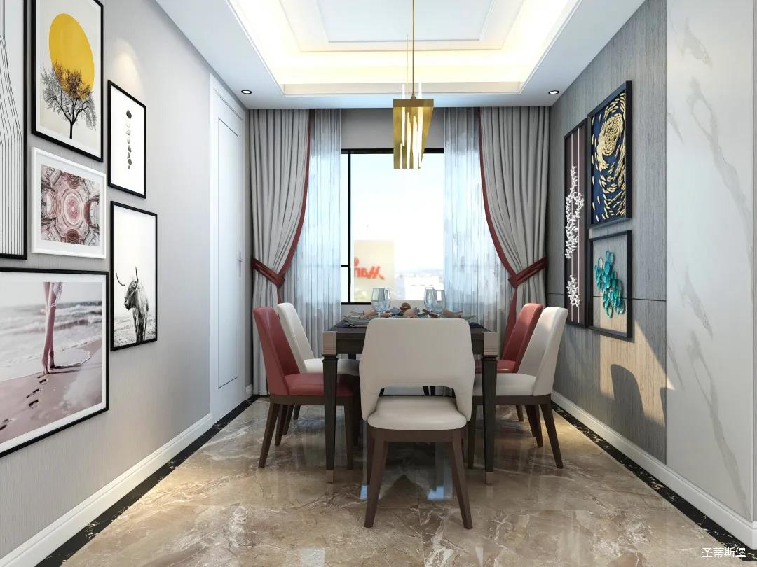 客厅与餐厅虽分两个空间展开,但无明显隔断,室内一眼望去,清透明亮,就近靠窗可引入秀丽美景,迎来充沛的阳光。造型灯线条也颇有意境,让空间圆润生动起来,整体显得大气雅致,轻奢有范。软装搭配的选择也极为重要哦,好的搭配才能彰显品位,色彩跳跃的装饰画,让整个空间鲜活生动,饱满有趣。