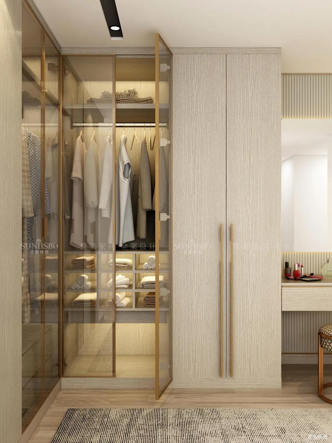 玻璃增加了衣柜的通透性,视觉上更为干净整洁。