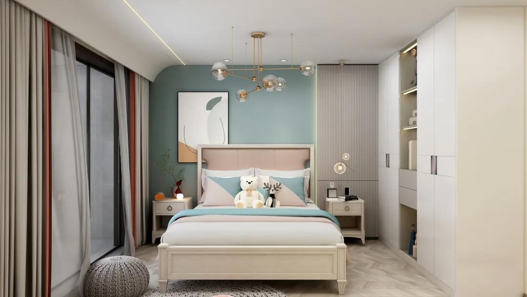 次卧浅灰色的背景墙时尚又内敛,入目尽显舒适的视觉感,为了避免过于单调,特意搭配了与整体保持一致的拼色窗帘,作为空间色彩的点缀。